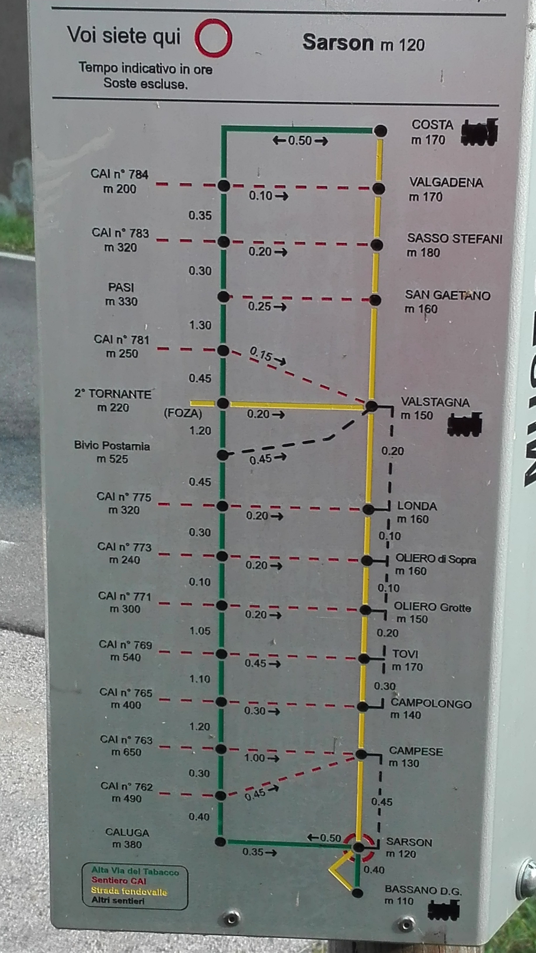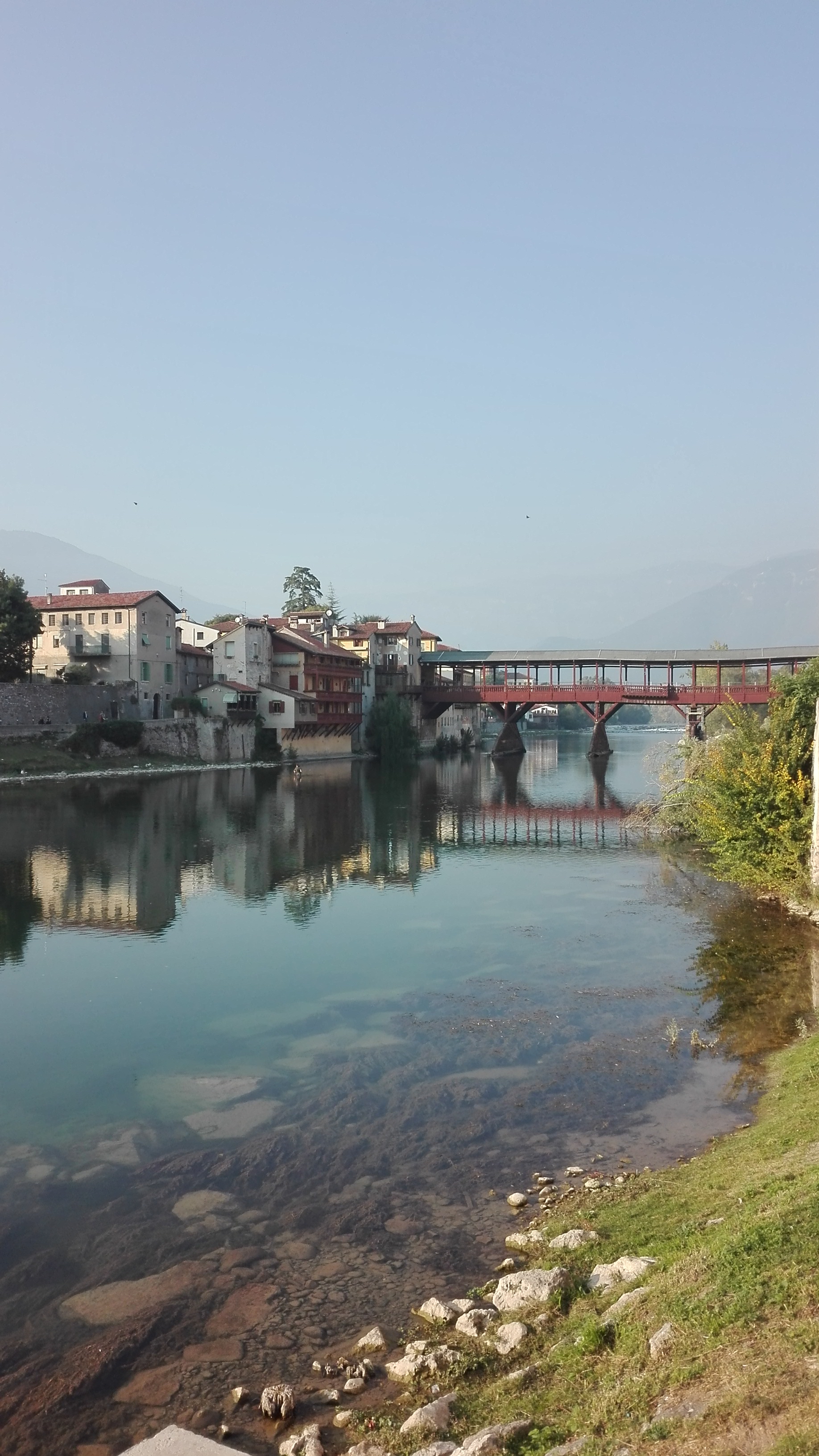 Bassano del Grappa ist eine sehr alte Stadt. Als ich das von meiner Vermieterin zu Verfügung gestellte Fahrrad sehe, weiß ich, dass ich mich damit sehr stilvoll an die Gegebenheiten anpasse. Es muss wohl aus den 60er-Jahren sein, das Jahrhundert ist allerdings unklar. Bremsen waren damals jedenfalls noch nicht erfunden, aber egal. Ich mache mich nach einem hausfraulichen Vormittag – Waschmaschine! – auf den Weg, um den laut Google sehr nahe liegenden Golfplatz zu erkunden. Leider geht es bald ziemlich abwärts Richtung Fluss, weshalb ich mein Rad schieben muss, um nicht in Lebensgefahr zu geraten.