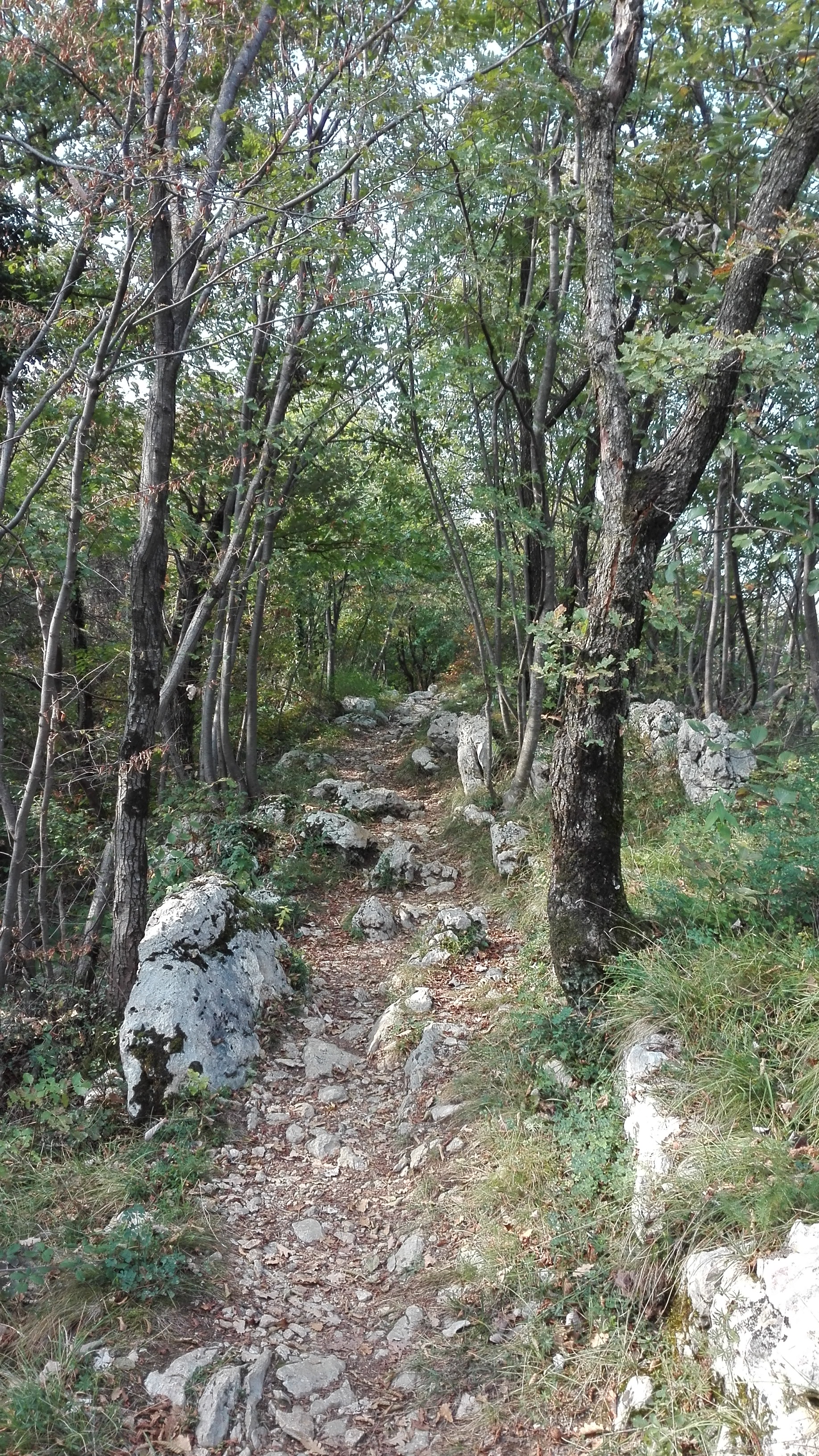 Dass dieser Wald mir die Begriffe Trittsicherkeit und Schwindelfreiheit neu erklären würde, wusste ich zum Glück vorher nicht. Vielleicht hätte ich mir auch leichter getan, wenn ich gleich, als ich den von irgend jemandem zurück gelassenen Wanderstock in Besitz genommen hatte, genau geschaut und dann festgestellt hätte, dass er an einem Ende gut zugespitzt war. So habe ich das gute Stück den ganzen steilen Abstieg lang verkehrt herum gehalten. Stellenweise ging es so bergab, dass Maschendrahtzaun ausgelegt war, um die Abrutschgefahr zu verringern.