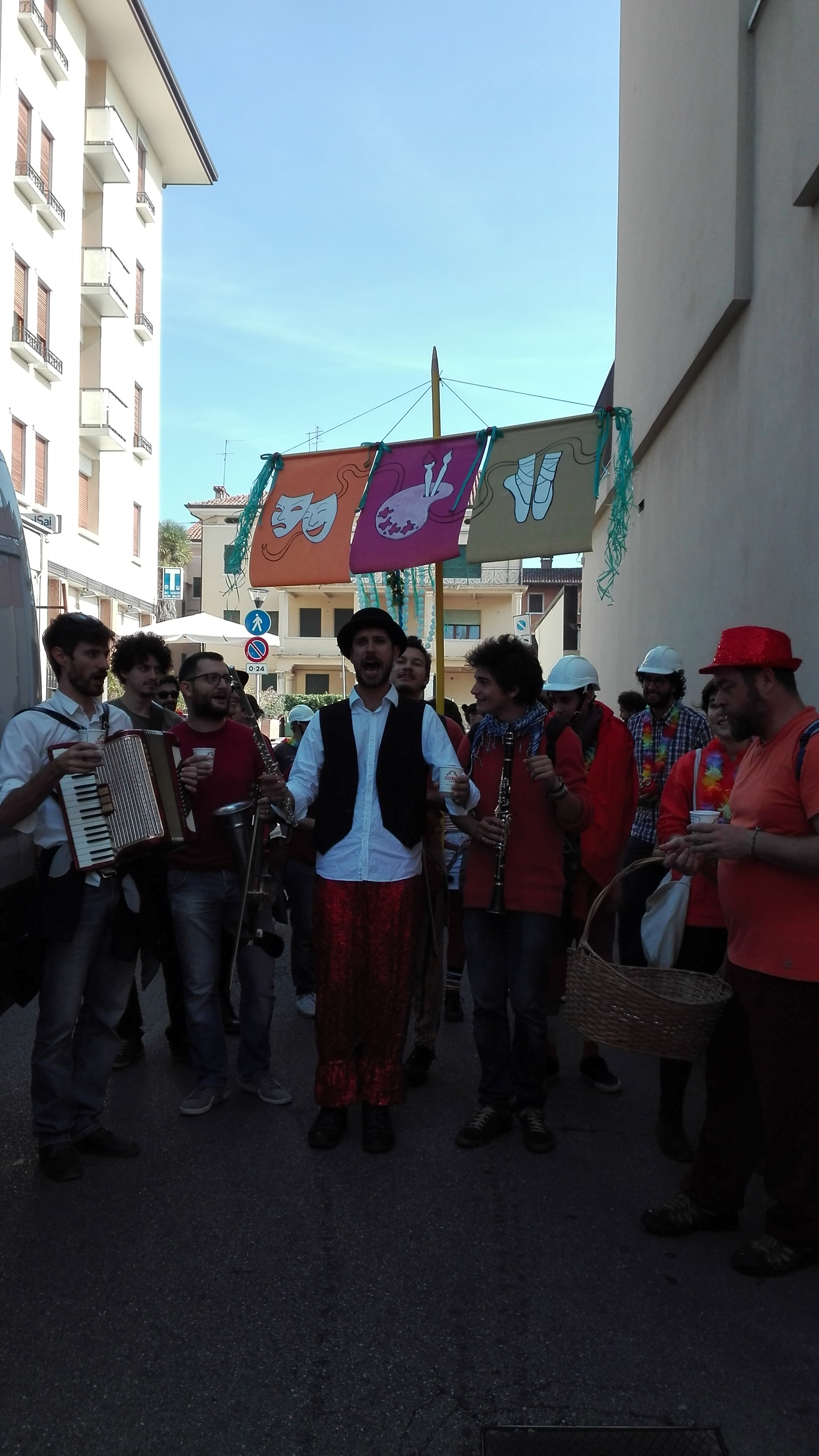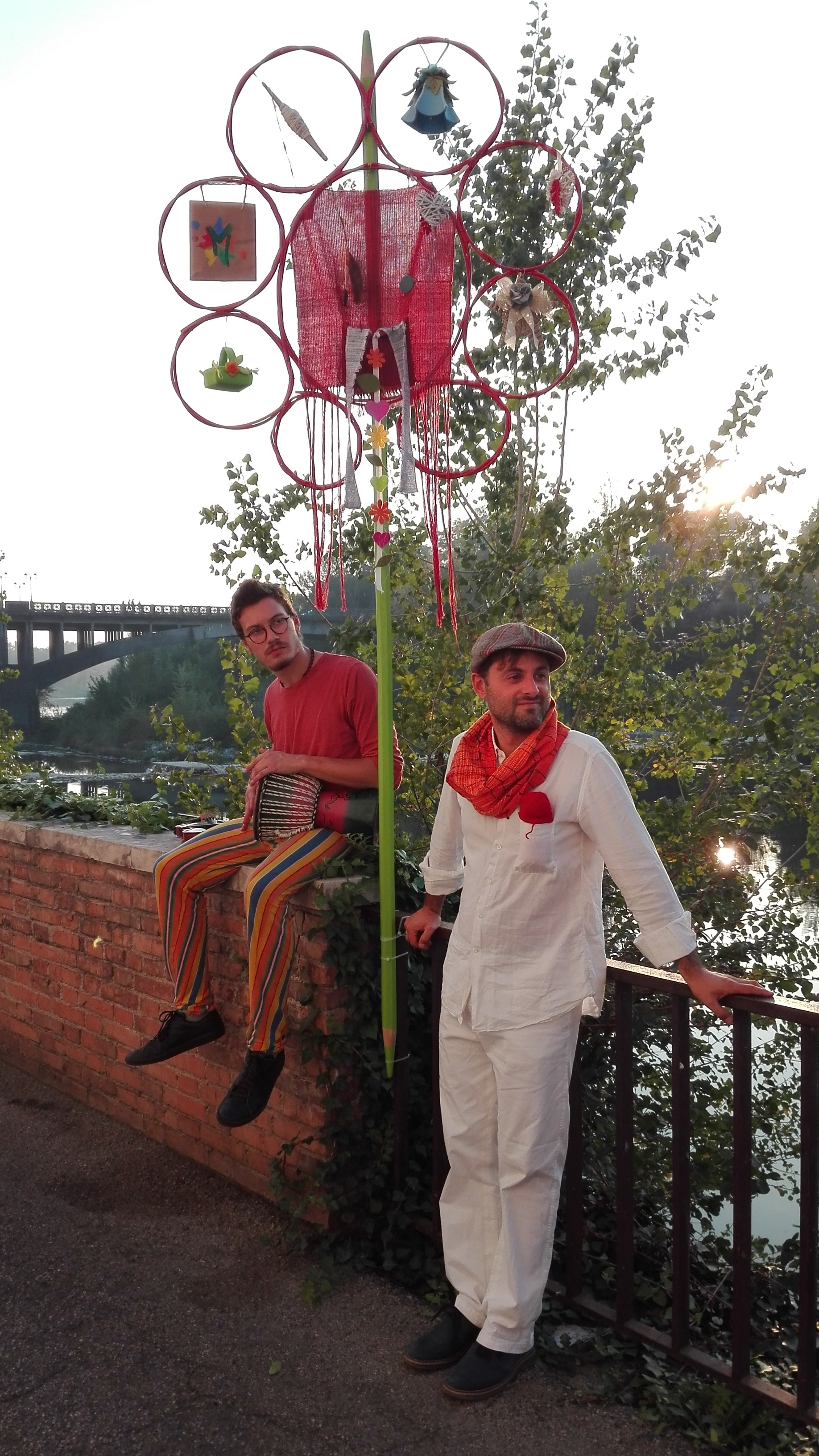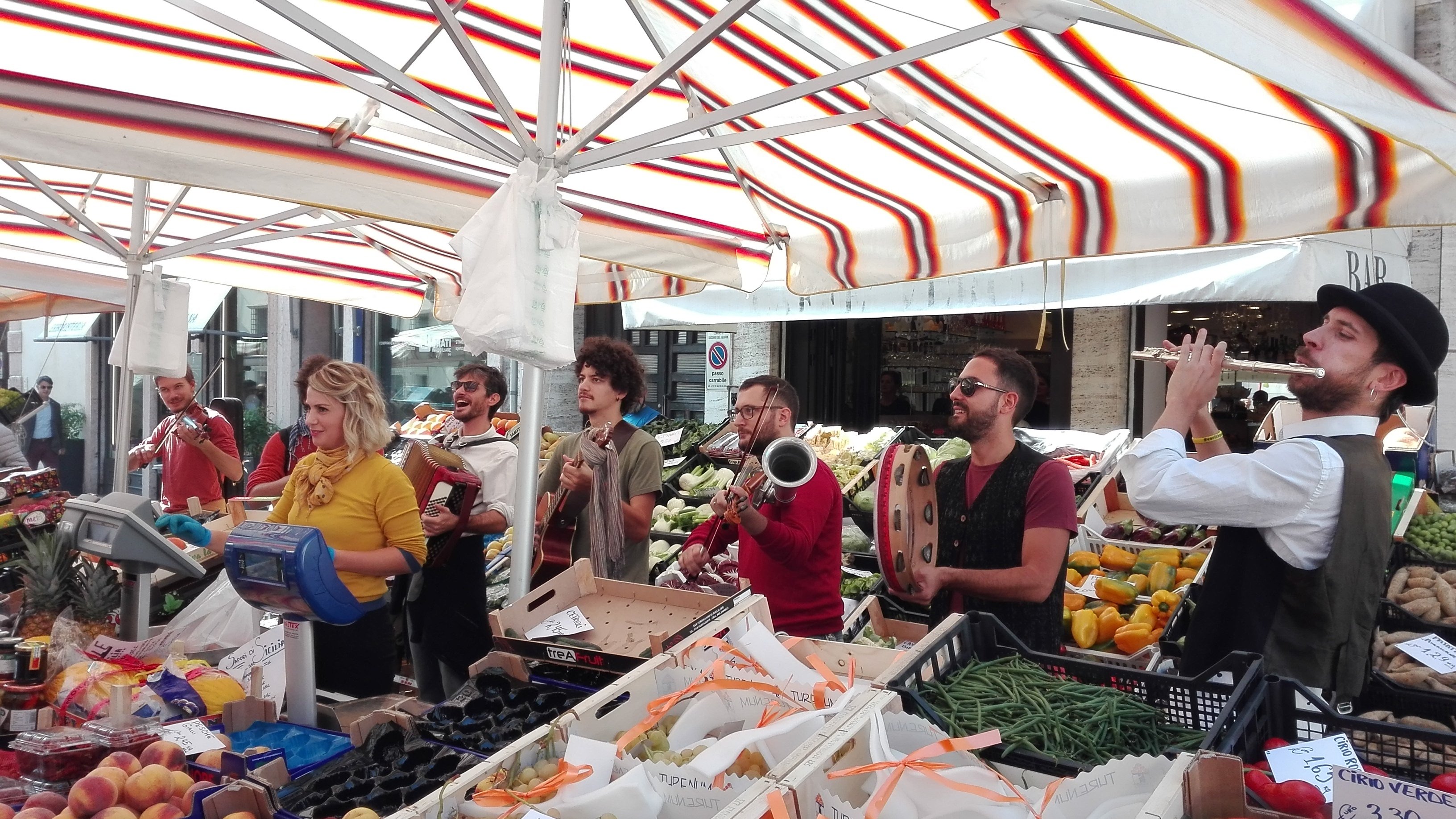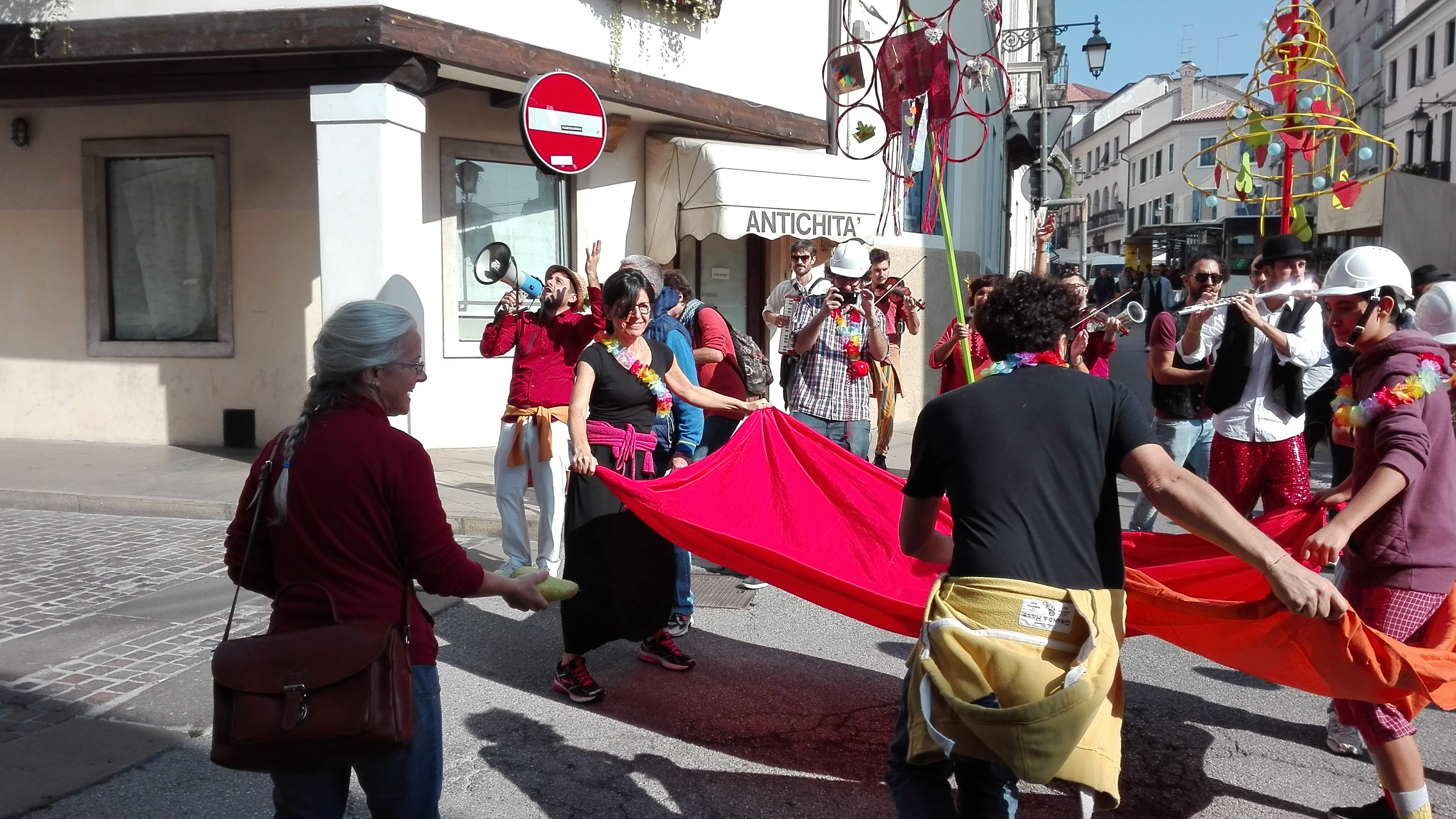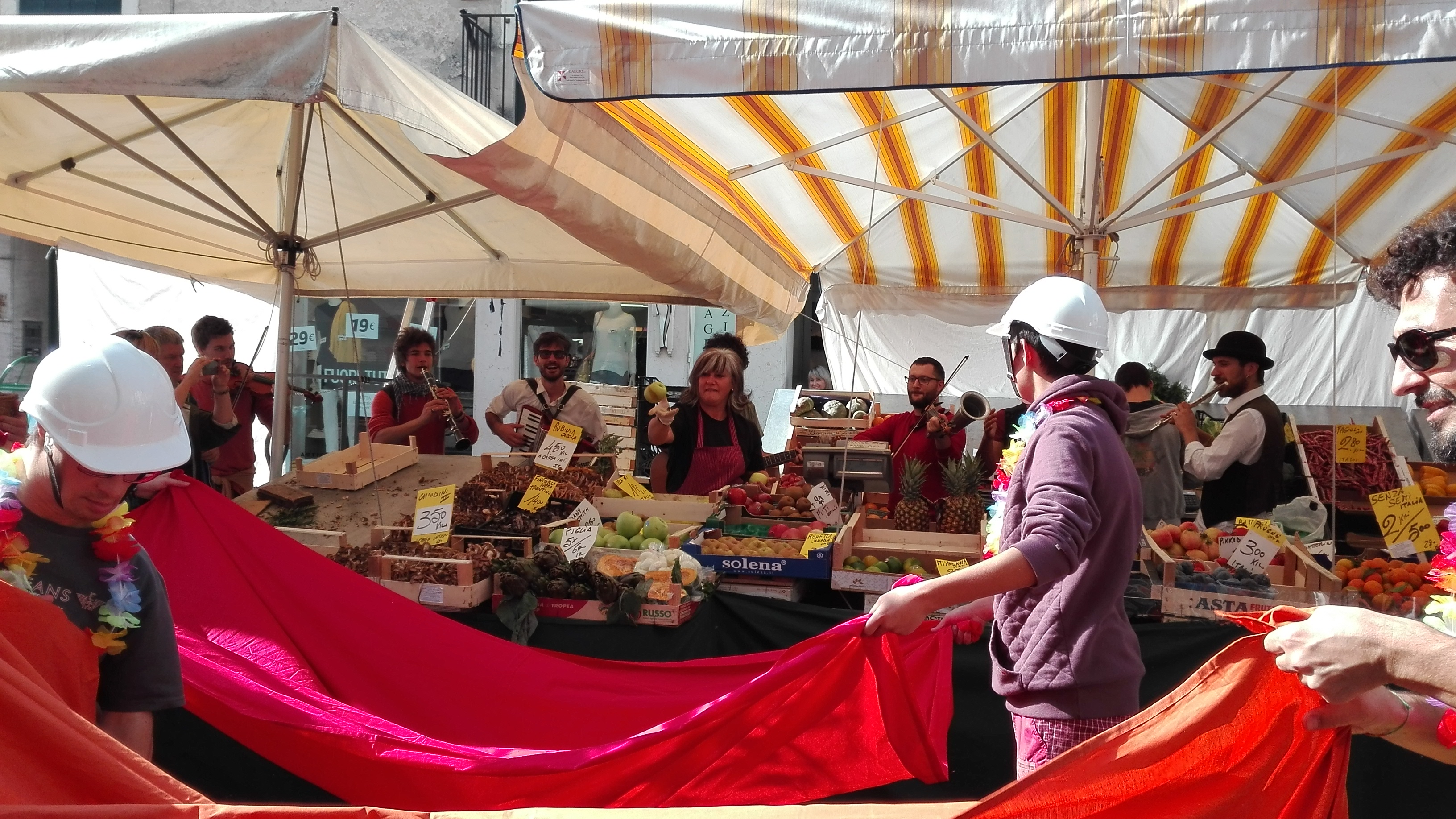 Zu Klezmer-Klängen und italienischen Volksliedern ziehen sie durch die Stadt und sammeln Früchte, indem sie bunte Tücher aufspannen und die Menschen auffordern, Obst hineinzuwerfen. Die Mannen an den Megaphonen leisten ganze Arbeit.