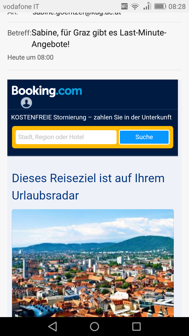 Booking.com ist neben Airbnb meine Buchungsplattform für diese Reise. Offensichtlich hat dort jemand entschieden, es sei Zeit, mich nach Hause zu locken.