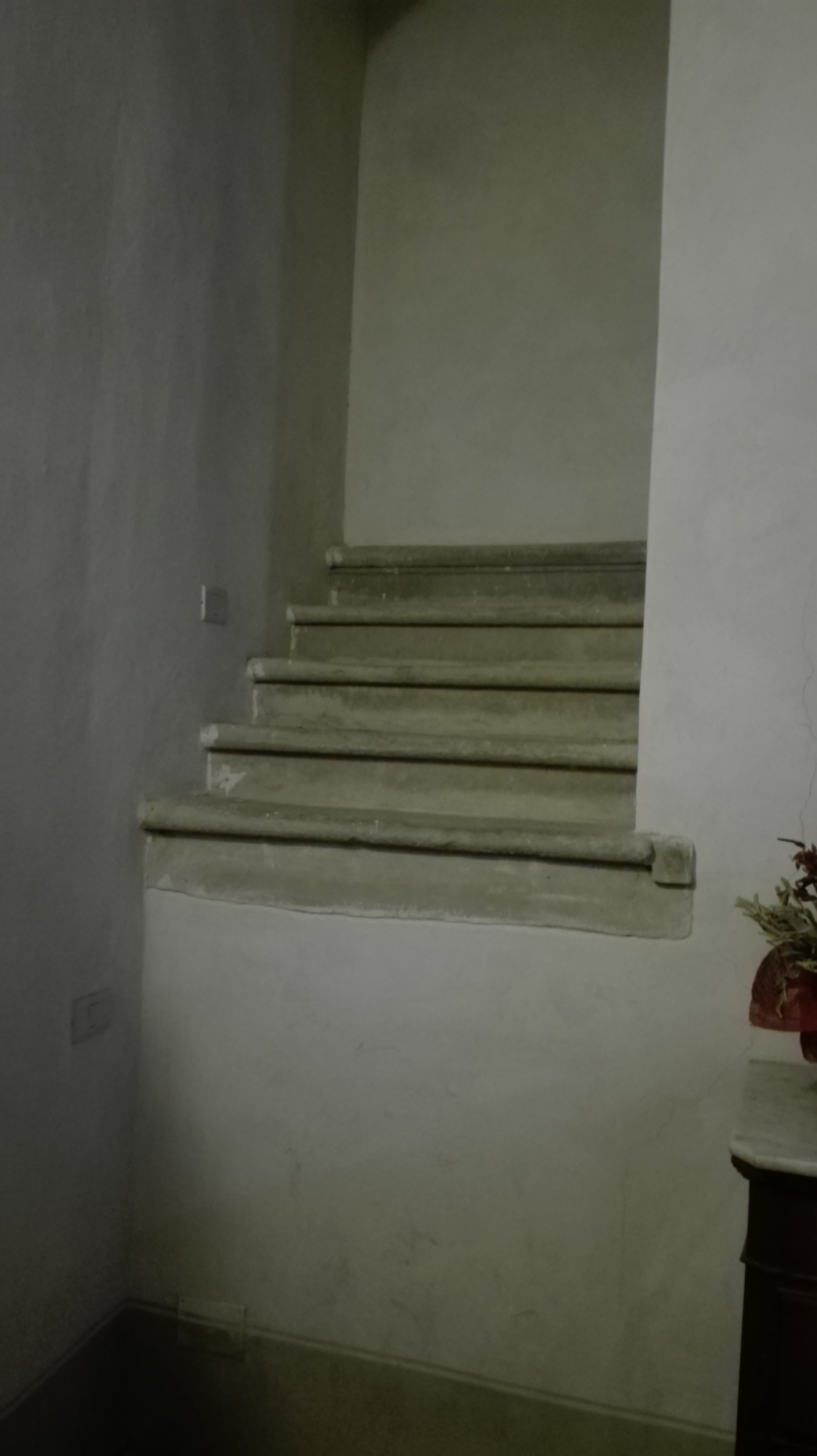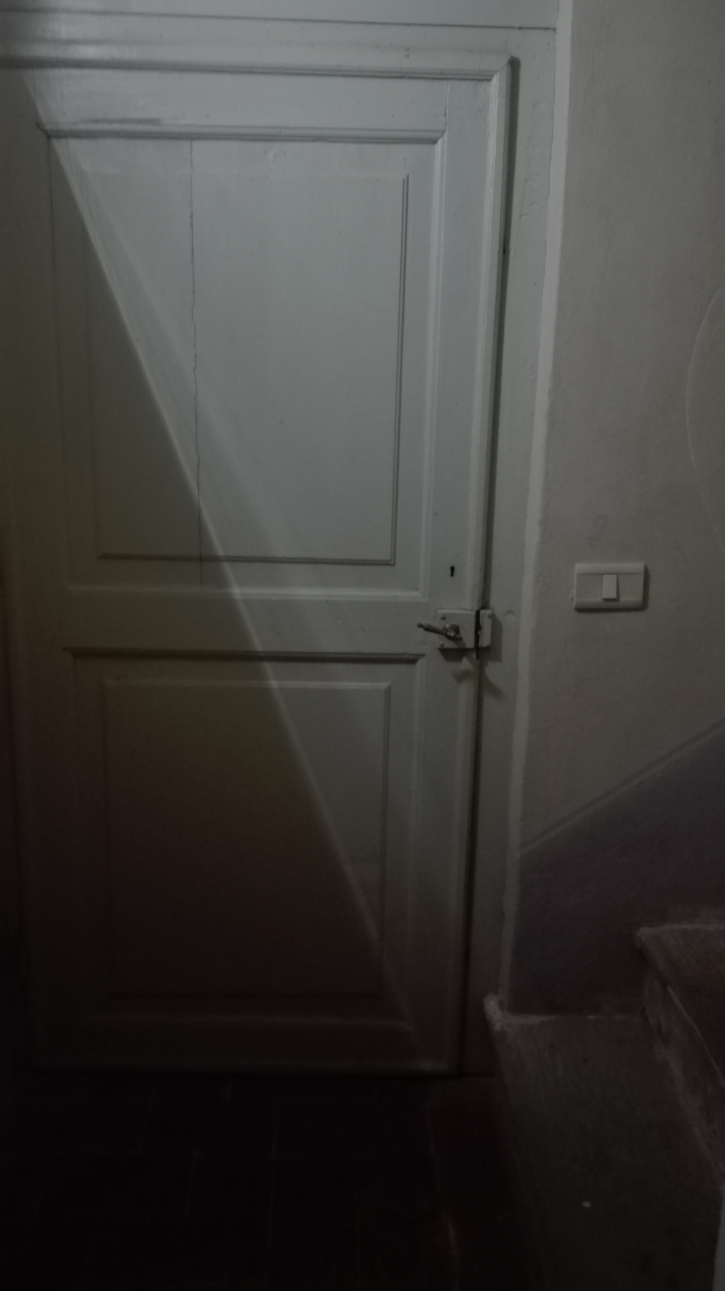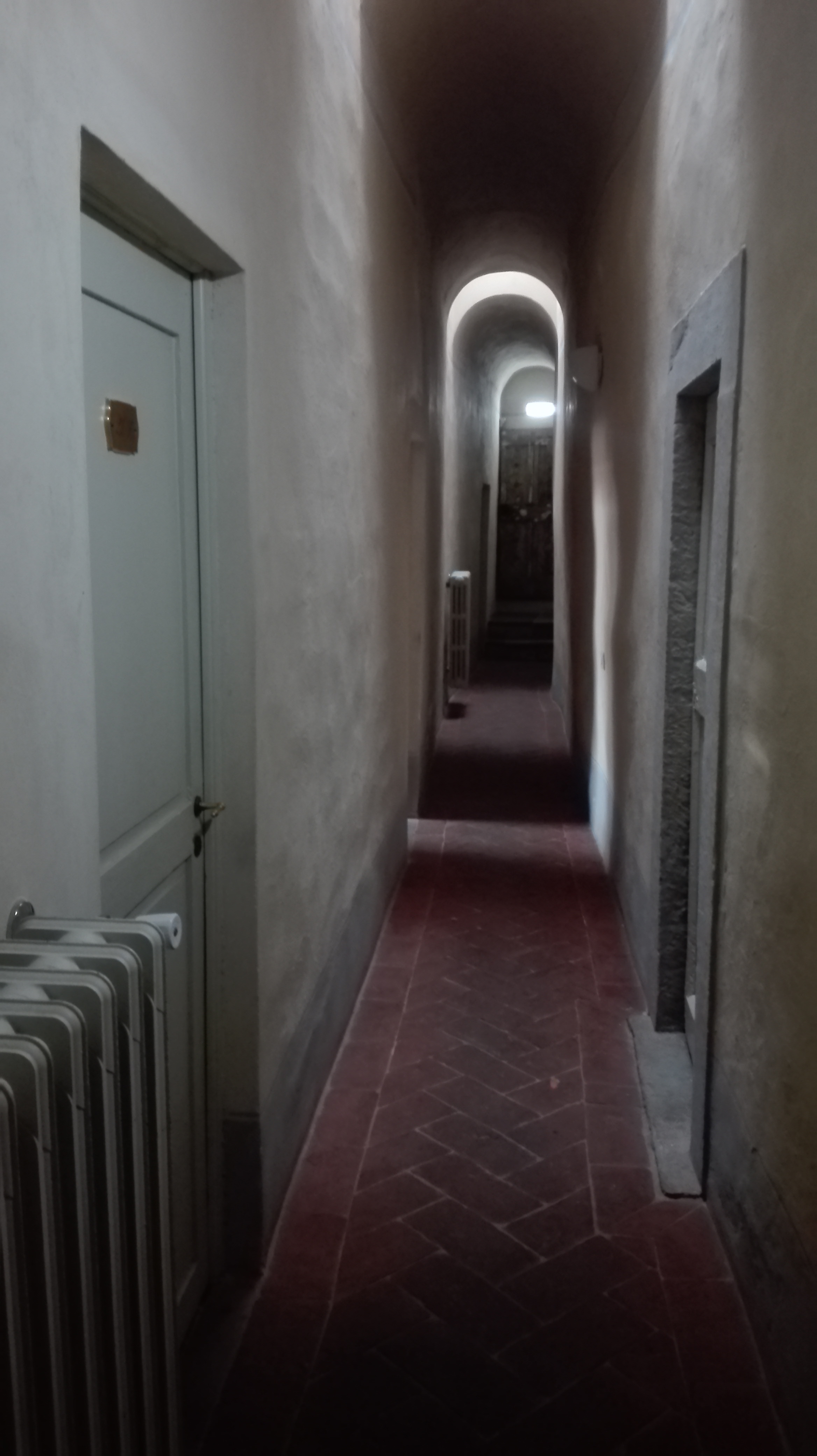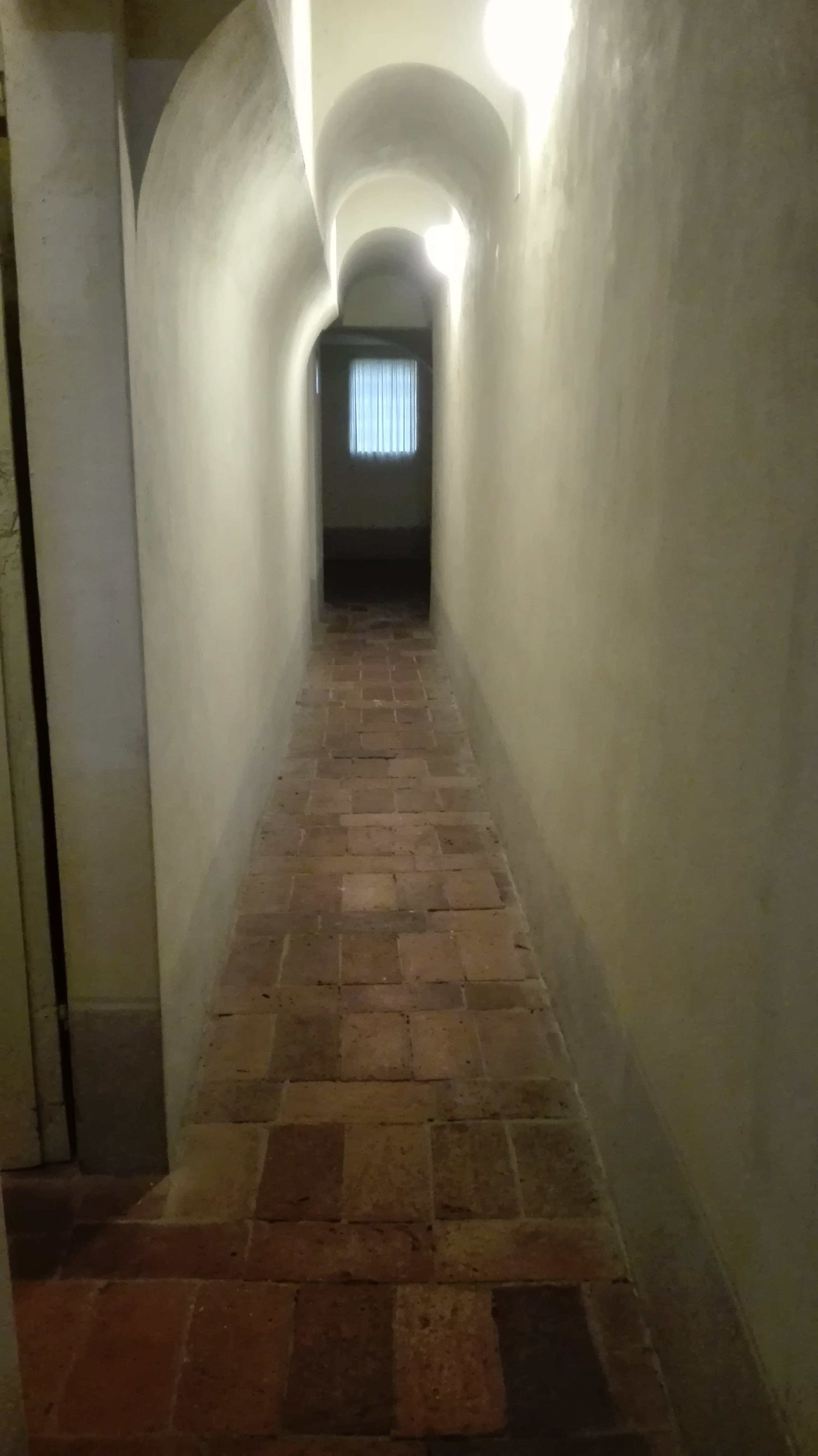 Als ich schon fast wieder bei meinem Zimmer bin (am Foto links, hinter der Heizung), fällt mir direkt gegenüber eine ältere, kleine Tür auf, mit einem Rahmen aus Stein und ohne Nummer.