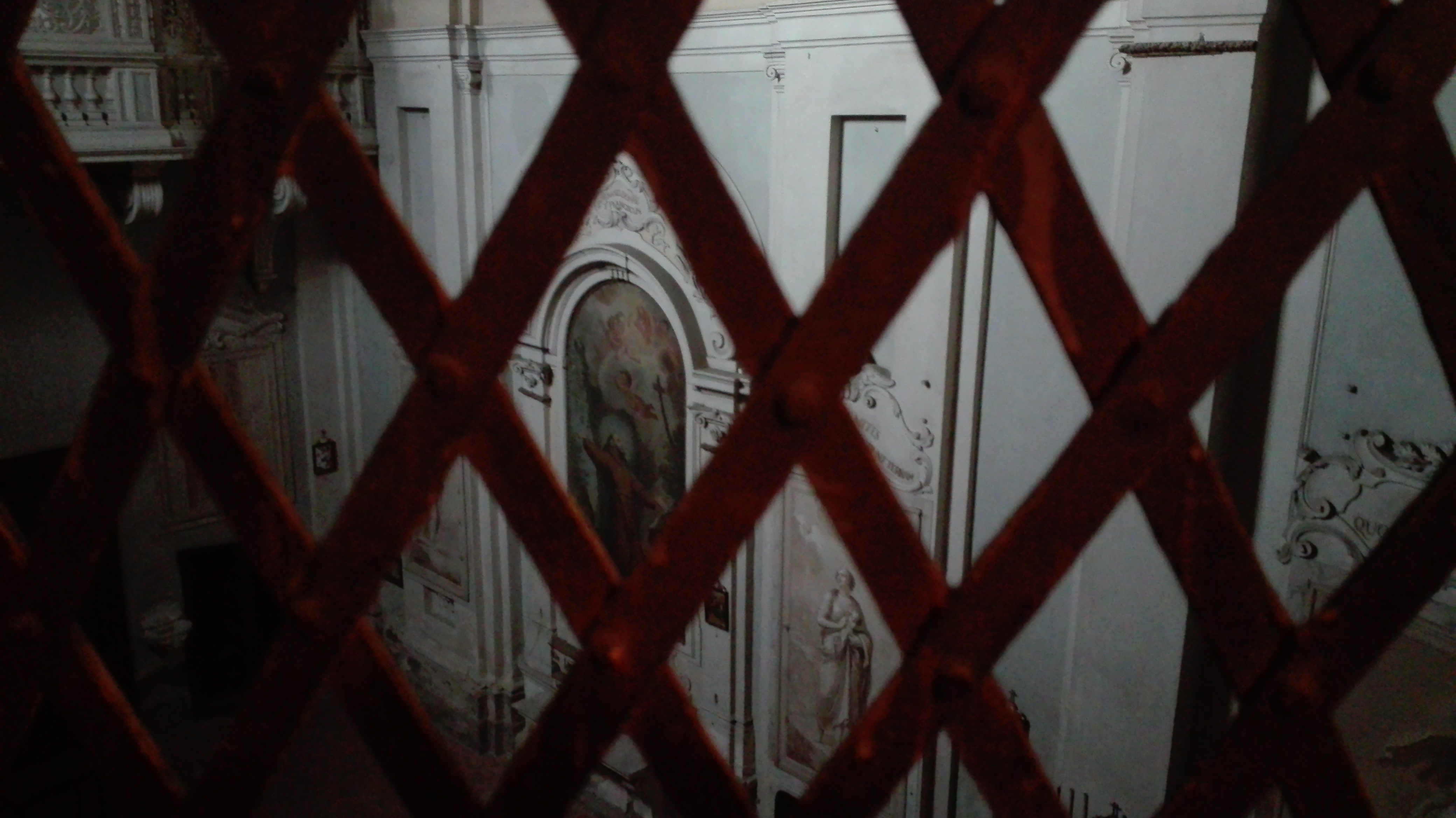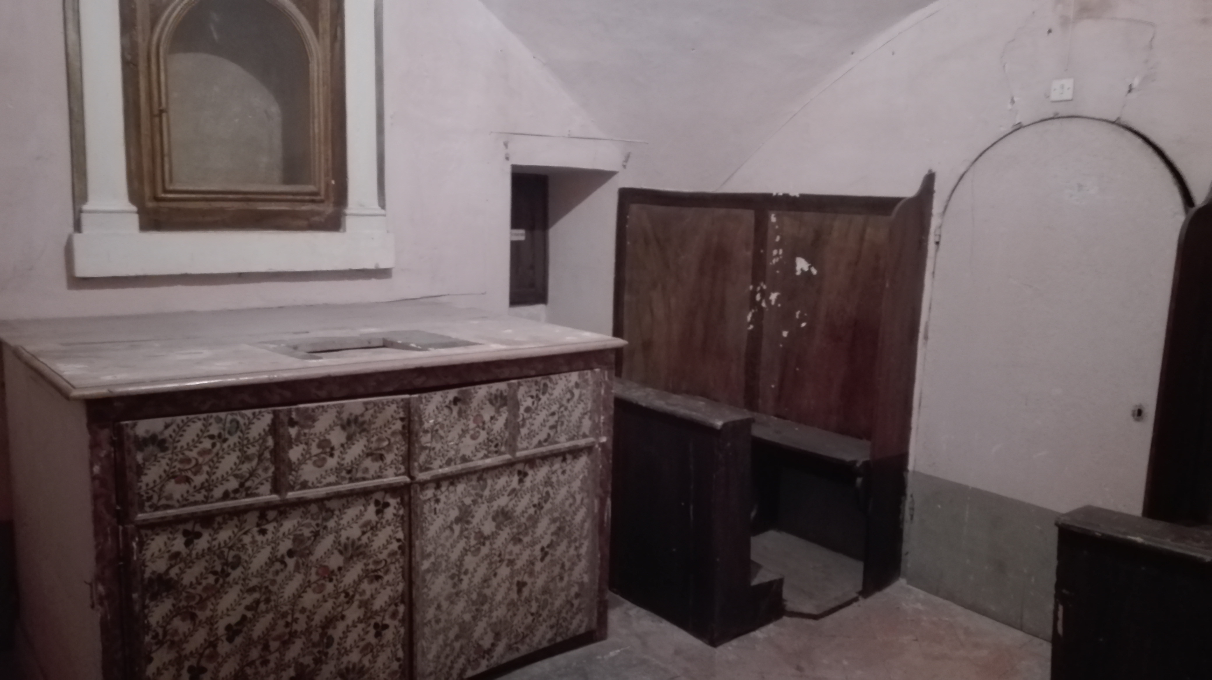 Rechter Hand ist eine durch ein Holzgitter geschützte Öffnung zu sehen! Schemenhaft erkennt man ein sakrales Motiv. Wo bin ich hier?