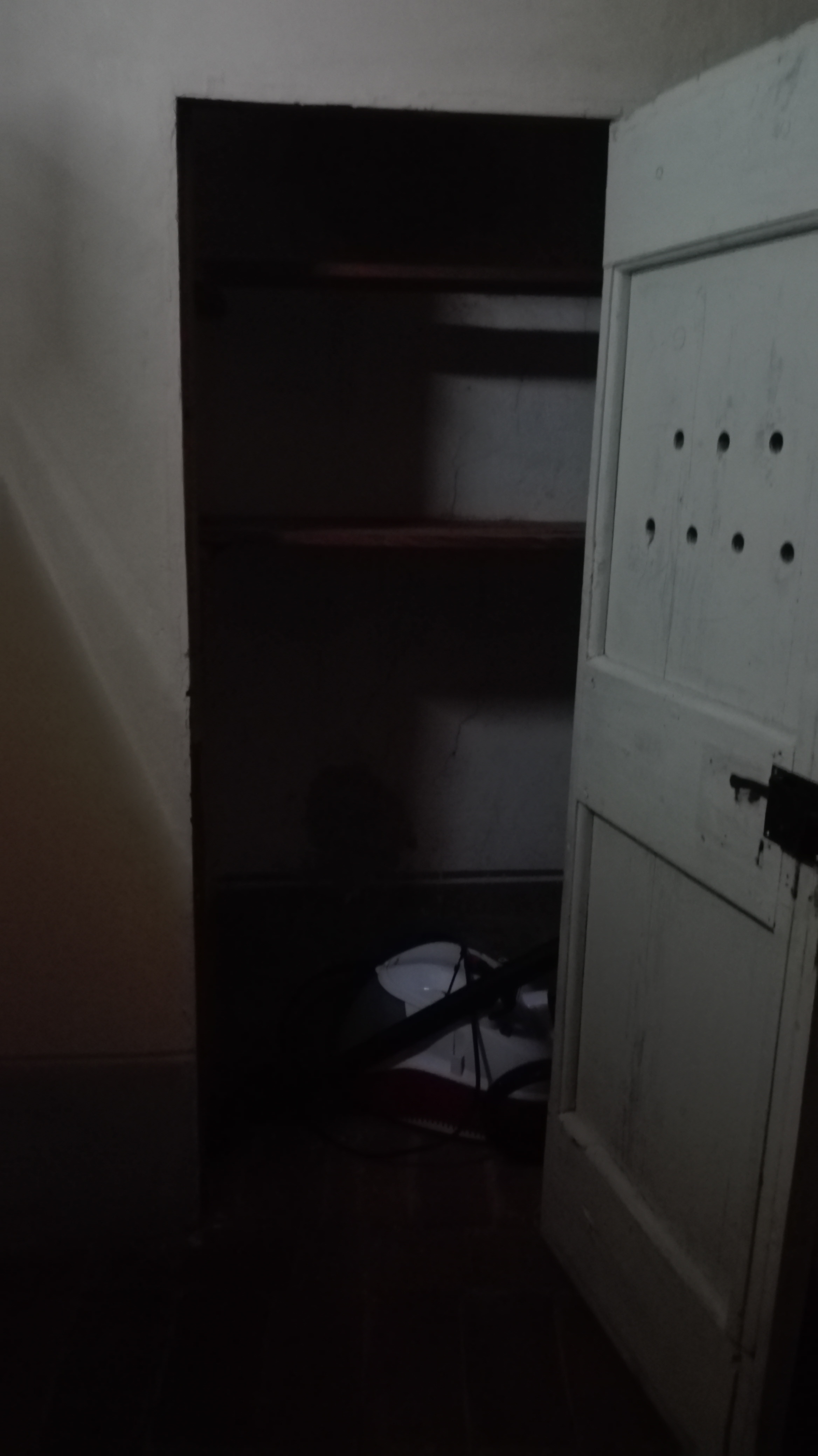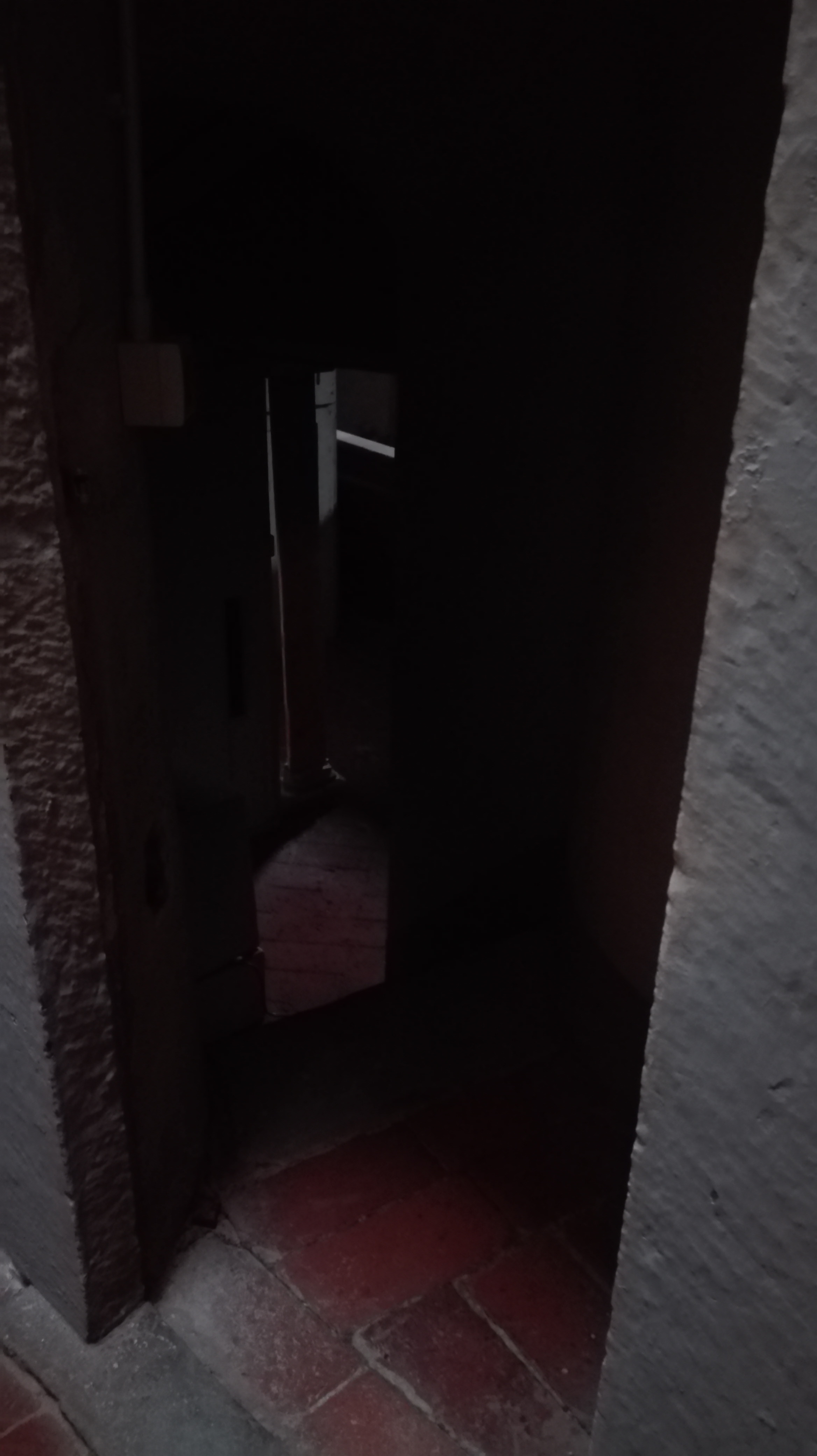 Beim Abstieg entdecke ich einen schmalen Gang, nach links öffnet sich eine Tür.