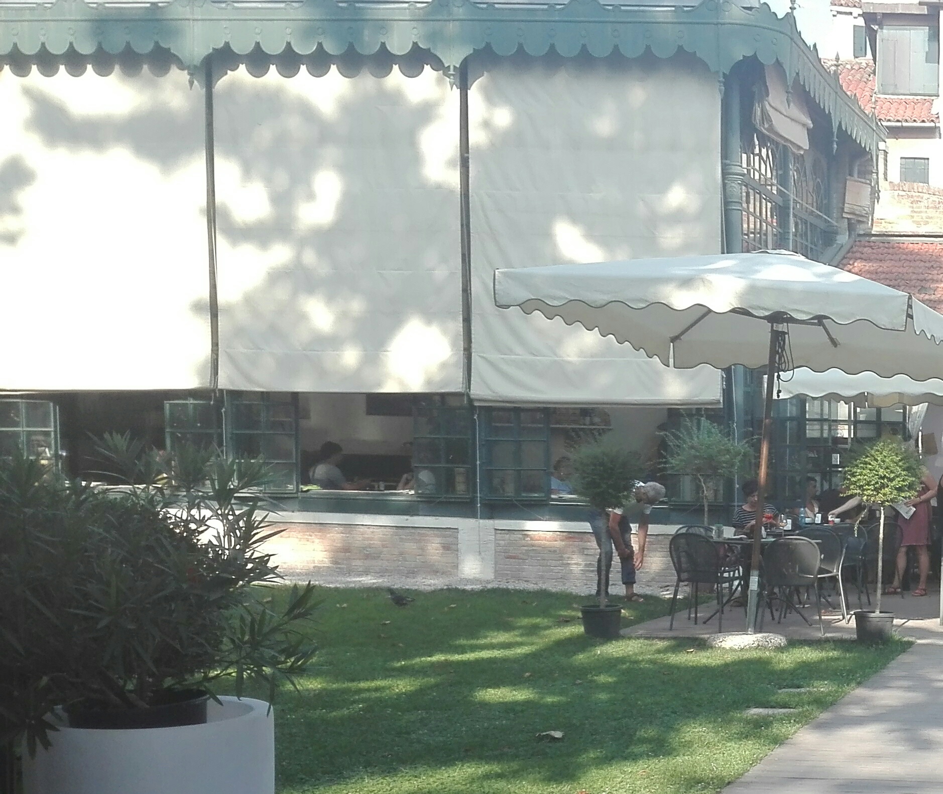 … sieht man dann auf der rechten Seite ein sehr unvenezianisches Gebäude mit einem so gar nicht typischen Gastgarten.