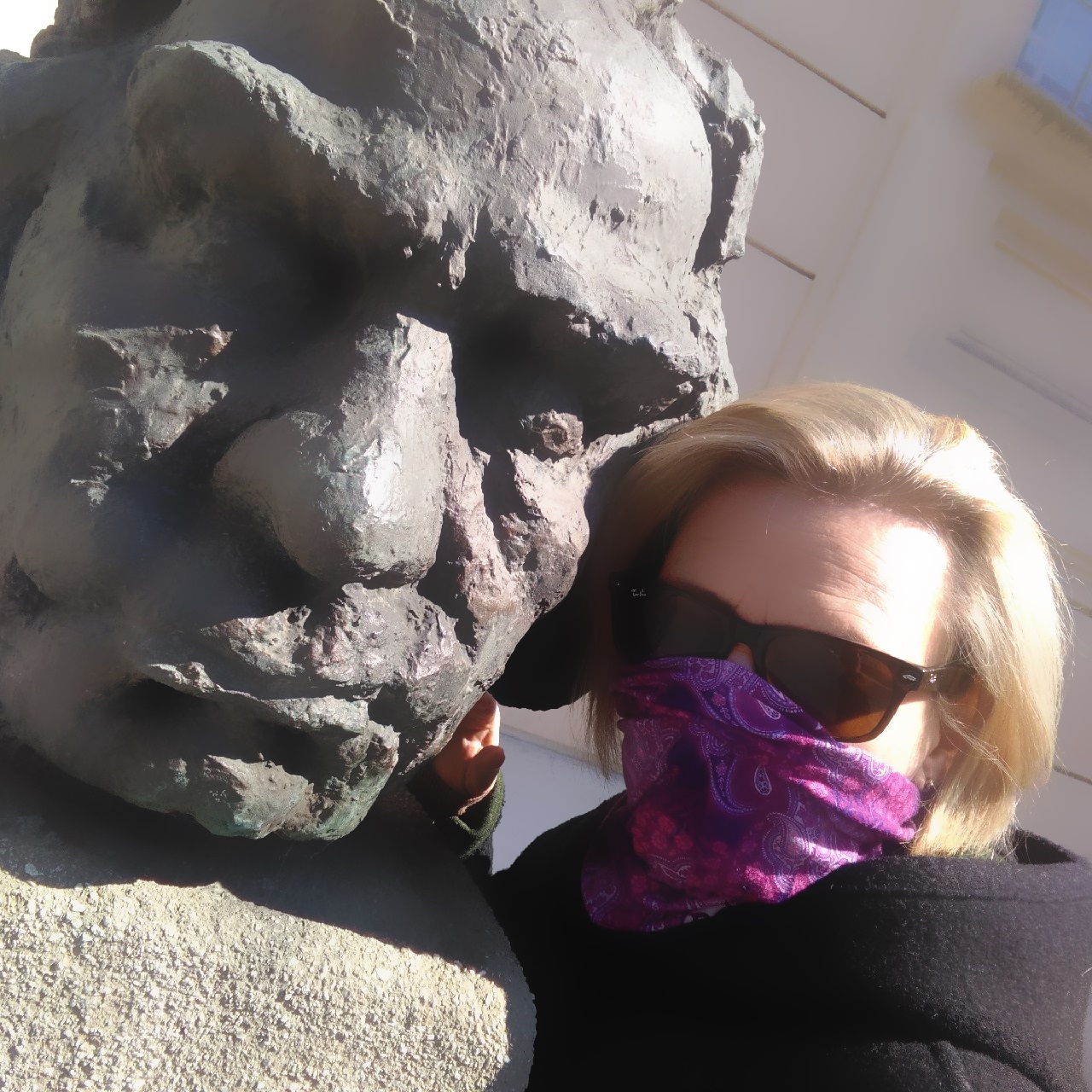 So, jetzt aber zum heutigen Rätsel. Unsere in Führung liegende Christa hat mir aufgetragen, ein Foto mit Maske zu posten. Bitteschön. Wer ist der Kerl und wo steht er momentan einsam in der Gegend herum (ich konnte richtig spüren, wie er sich über unser Selfie freute)? Doppelfrage, trotzdem gibt`s nur einen Punkt. Ich bin heute ein wenig unleidlich und daher nicht verhandlungsbereit.