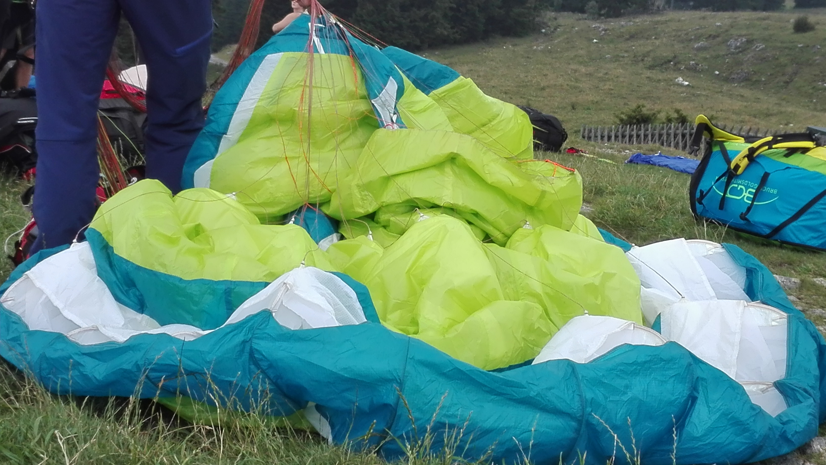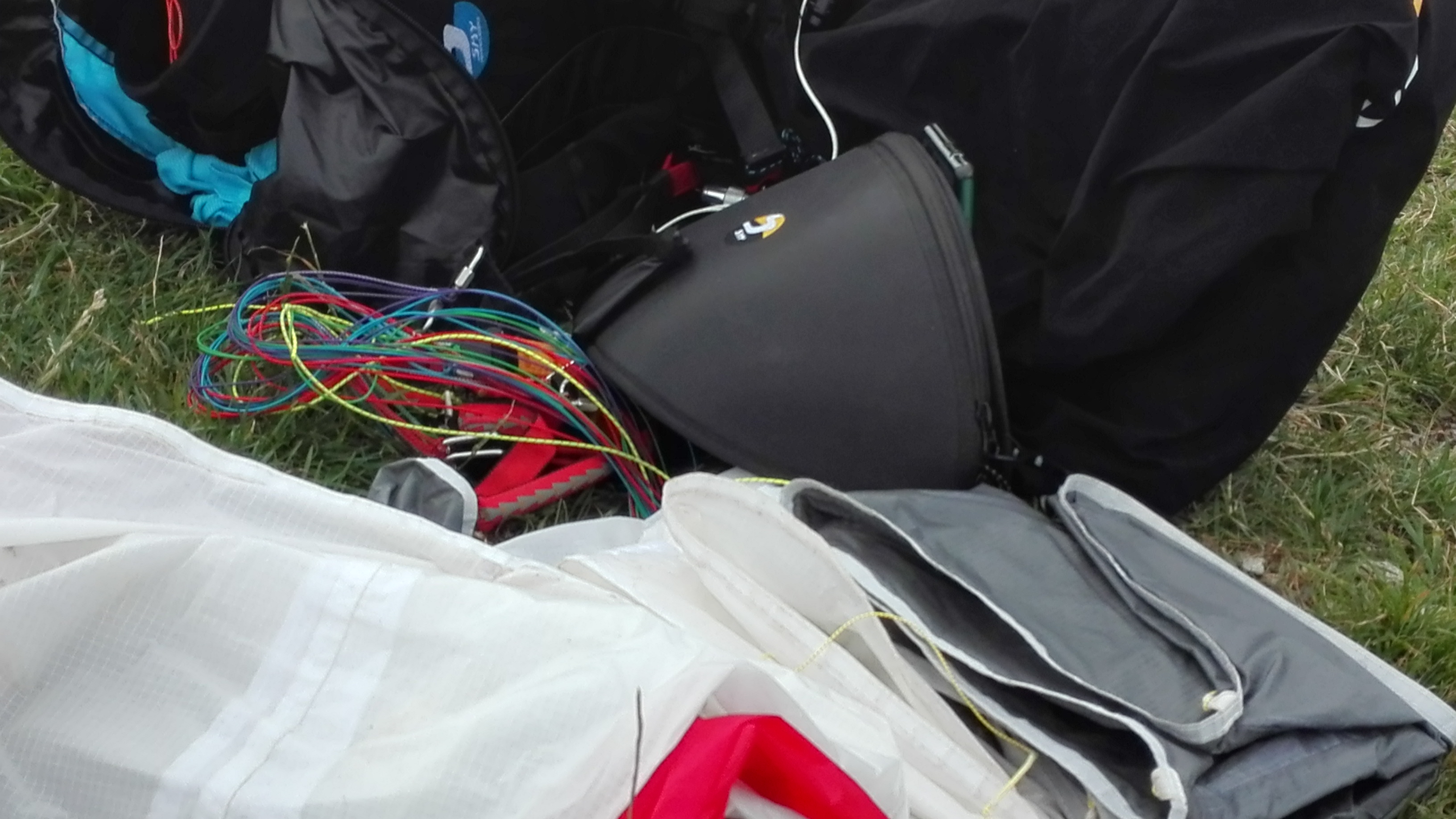 Ich muss zugeben, dass es beindruckend war, dabei zuzusehen, wie in ganz großer Ruhe entwirrt, geschlichtet und zurechtgezupft wurde. Langsam klärte sich auch das Rätsel, wie der Schirm samt Stricken mit dem Körper verbunden wird. Man steigt in so eine Art Gestell, wobei ein sehr seltsam aussehender halberter Schlafsack hinter dem Köper leer nach unten und ein Notschirm in einem kleinen Rucksack oben am Rücken hängen. Vor der Brust hatte mein Beobachtungssubjekt ein kleines Cockpit, darauf montiert ein Handy und irgendwelche beeindruckenden anderen elektronischen Kasterln. Und überall baumeln Karabiner, in denen die Stricke befestigt werden. Dann begibt man sich aus der Vorbereitungsposition vor zum Start. Der Schirm wird schön ausgebreitet und es beginnt das Warten auf die richtigen Windverhältnisse. Dabei standen die meisten mit dem Rücken zum Abgrund und für mich sahen die Stricke noch immer nicht vertrauenswürdig aus. Plötzlich eine Drehung, ein paar Schritte schon fast ins Leere und…. er fliegt! Jetzt erschließt sich auch die Sinnhaftigkeit des halben Schlafsacks, in den sich der Flieger nämlich hineinlegt. Das sieht dann direkt sehr gemütlich aus, dient aber, wie ich später erfahren sollte (siehe unten), ausschließlich dazu, den Reibungswiderstand zu minimieren.