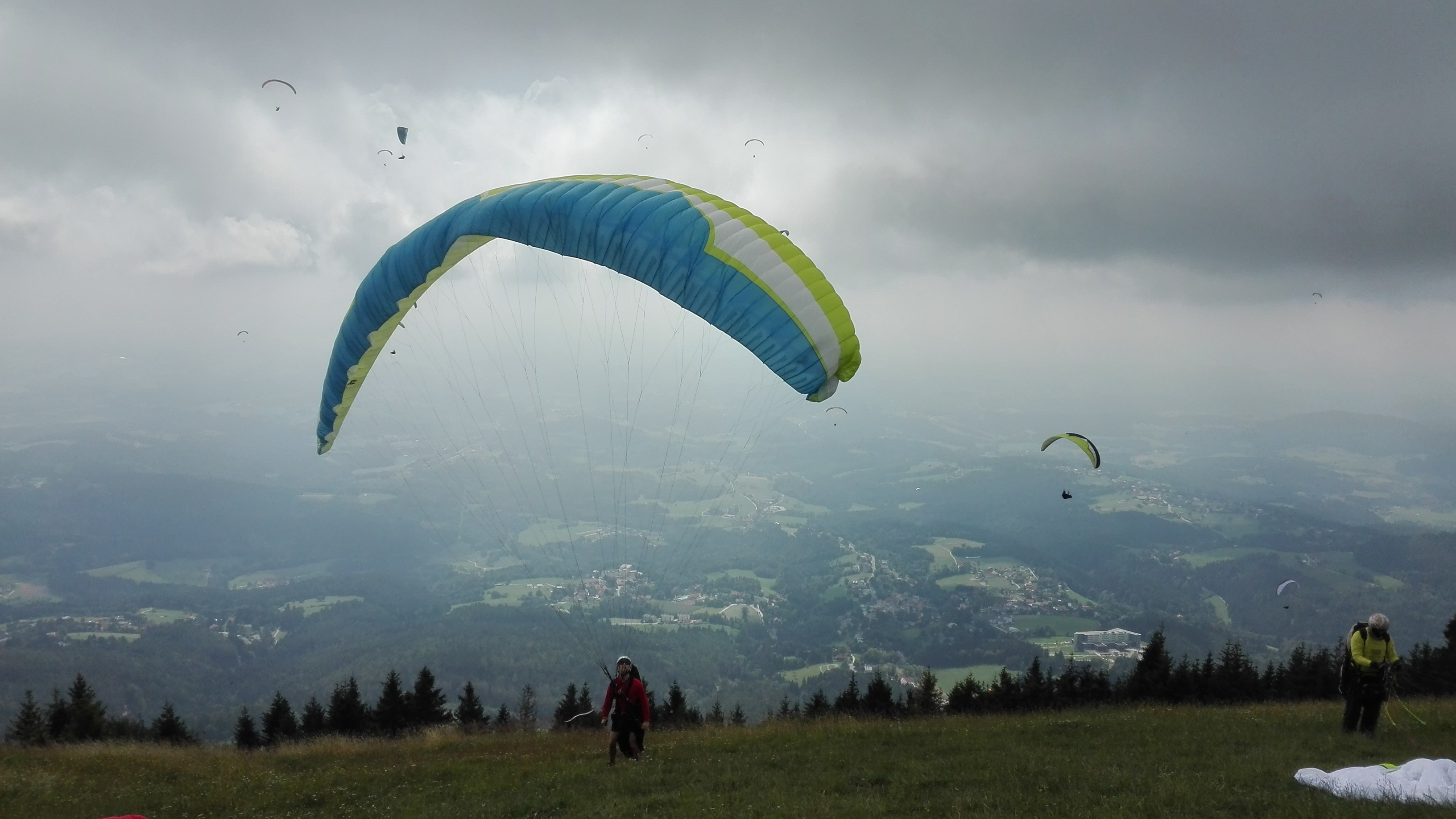 Ich beschloss, mir diesen Wahnsinn aus der Nähe anzusehen und stapfte dem Rucksackrudel hinterher zum Abflugplatz, der bevölkert war wie eine innerstädtische Eisdiele während der laufenden Hundstage. Lauter hoffnungsvolle meist junge Männer und einige wenige sehr junge Frauen, stürzten sich mithilfe des böigen Windes über eine steile Wiese in den überraschenderweise bewölkten Himmel. Auch zwei Tandemflieger waren dabei. Ich ging in mich um zu überlegen, für wie viel Geld ich für so etwas Gewagtes zu haben wäre. 25.000,- Euro müsste man mir geben, dann würde ich mit dem Leben abschließen und springen. Eigentlich arg, wie wenig mir mein Leben wert ist :-).
