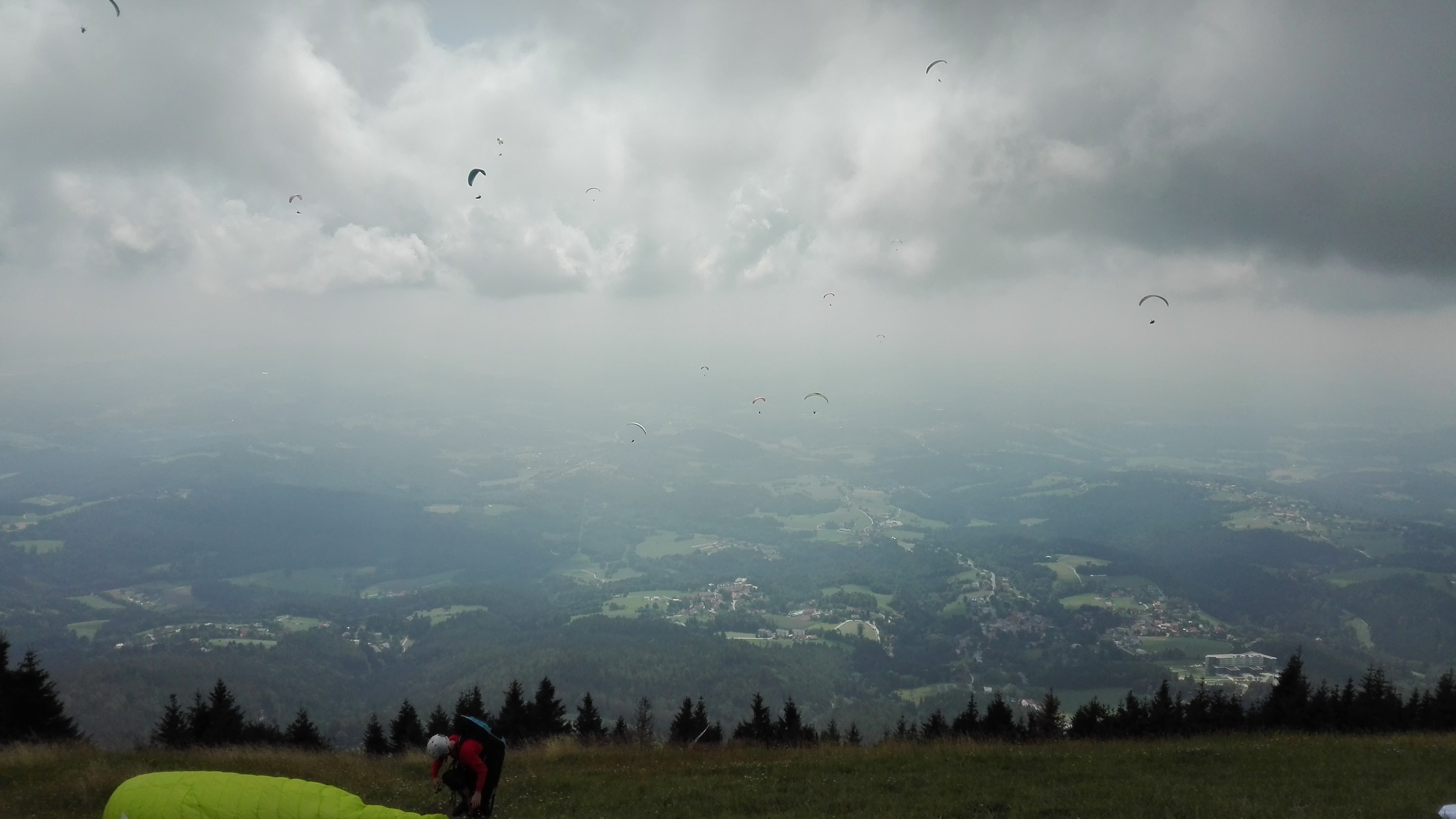Komm auf den Punkt, Sabine. Wenn ich noch wüßte…? Genau: ich wollte Abkühlung und nahm daher den Bus nach St. Radegund, um von dort aus den Schöckl heimzusuchen. In diesen Bus stieg – auf Höhe LKH – ein perfekt wandermäßig gestylter Mann ein, der nicht dem gängigen Bild eines Busbenutzers entsprach, sondern eher dem eines frisch dem Tourismus-Werbeprospekt entsprungenen Bergfex. Sein wirklich abartig großer Rucksack löste in mir allerlei Phantasien aus. Jakobsweg? Aber der ist doch eher in der Obersteiermark, oder? Weitwanderer? Vielleicht hatte er einen Unfall, ist im Krankenhaus gelandet und kann nun gesundet weitermarschieren? Als ich dann an der Talstation noch mehrere solche Monsterrucksackmänner herumwuseln sah, fiel der Groschen. Paragleiter! Der wandelnde, oder besser fliegende Alptraum für mich. Wie kann man nur so leichtsinnig mit seinem Leben umgehen? Ein wenig Stoff, mit dem Körper irgendwie verbunden, soll reichen, durch die Lüfte zu schweben?