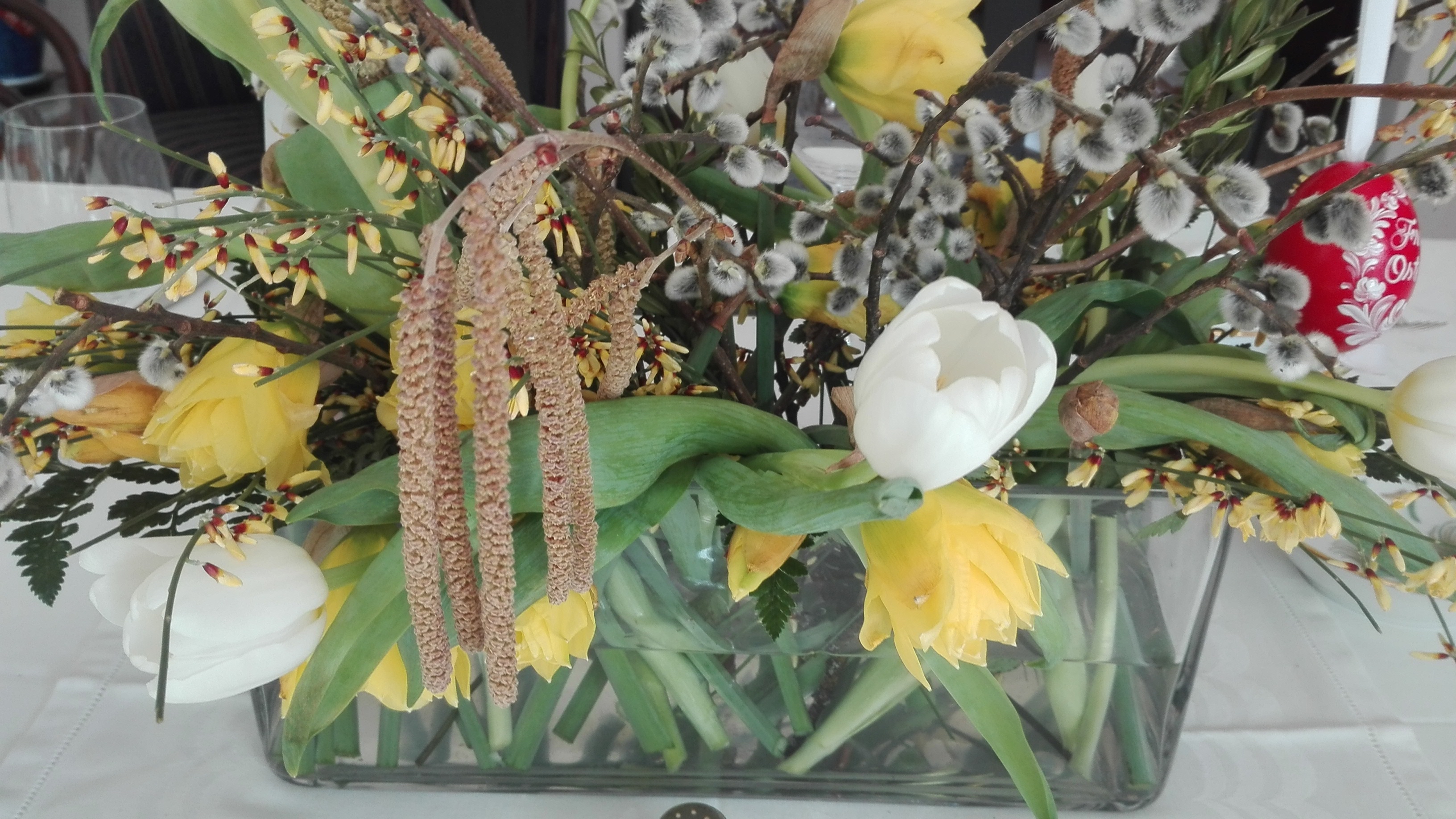 „40 Tage vor Ostern beginnt am Aschermittwoch die Fastenzeit, was bedeutet, dass wir einen Heringschmauß veranstalten und ganz viel essen und trinken, weil wir dann ja so lange darben müssen. Wir putzen unsere Wohnungen sehr ordentlich. Wenn alles blitzt, dürfen wir den Osterstrauch schmücken. Dazu nehmen wir Palmkatzerln [auf Englisch? Keine Chance, zum Glück hatte ich Anschauungsobjekte zur Hand], die in eine Vase gesteckt werden. Dann braucht man Hühnereier, die ausgeblasen, bemalt, beklebt oder auch umhäkelt und an bunten Bändern auf die Palmkatzerln gehängt werden.“